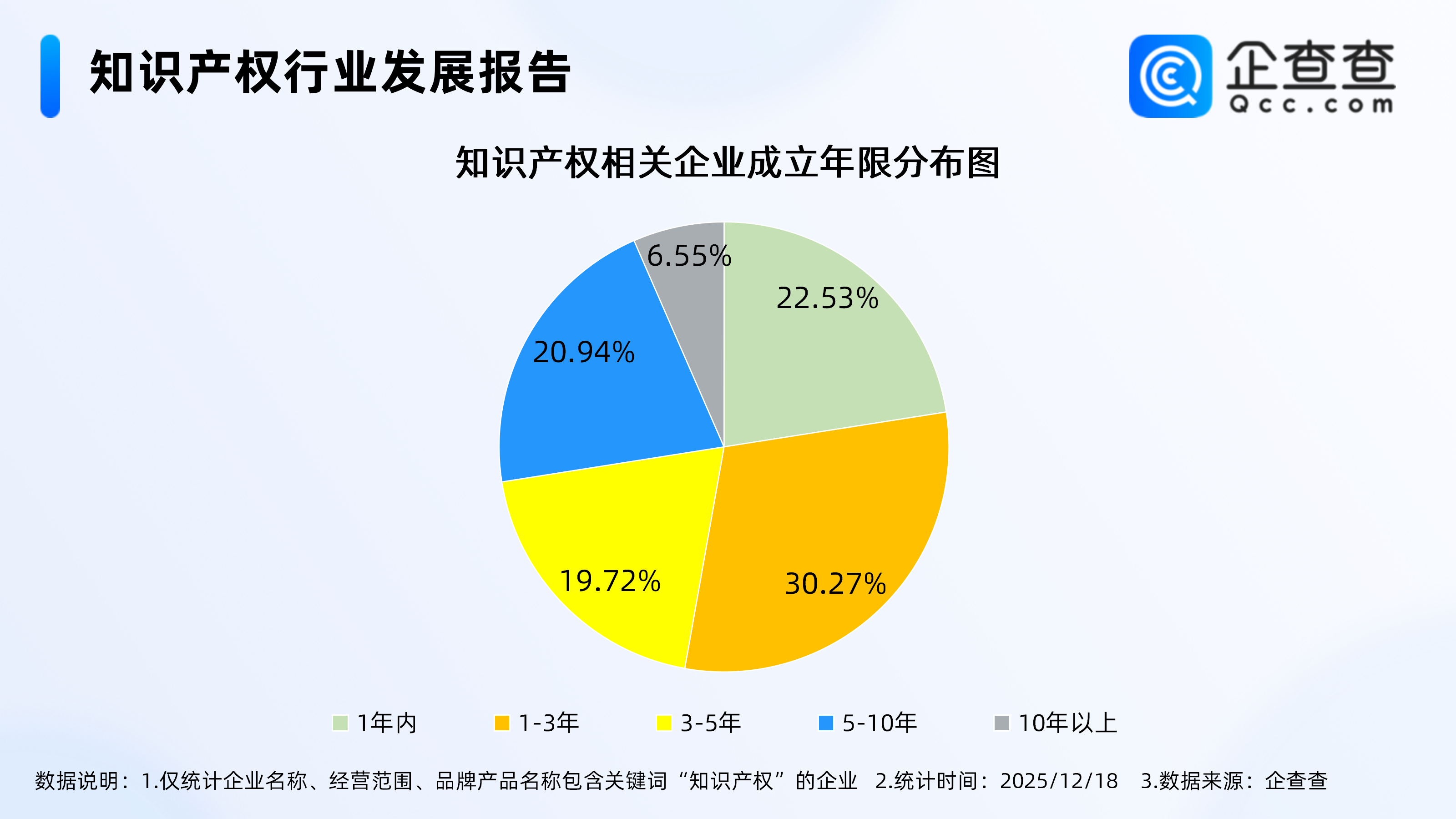 国家知识产权强国建设工作部际联席会议办公室会同有关方面编制完成《知识产权强国建设发展报告(2025年)》。2025年,我国全球创新指数排名首次跻身前10位,全球百强科技集群数量连续三年居首。知识产权强国建设指数达131.8分,较上年提高6.3分。地区知识产权发展指数平均得分提升至81.73分,粤、沪、京、浙、苏等地位居全国前列。知识产权服务业贯穿知识产权制度运行的各环节,是推动知识产权高标准保护的重要支撑。大力发展知识产权服务业,既是知识产权事业发展的需要,也是适应经济社会发展的需要。《2025年全国知识产权服务业统计调查报告》显示,2024年行业总营业收入达2940亿元,行业向专业化、数字化方向升级,整体呈现稳中向好的发展态势。企查查数据显示,截至12月18日,国内现存知识产权相关企业77.58万家。存量方面,从经营时间来看,相关企业多成立于近三年,成立年限在1-3年的相关企业最多,占比30.27%。从注册资本来看,相关企业多为轻量级企业,注册资本在100万元以内的相关企业近半,占比49.76%。注册量方面,近十年知识产权相关企业注册量呈显著增长态势,2024年全年注册15.06万家相关企业,截至12月18日,今年已注册17.49万家相关企业,远超去年全年注册水平,较去年同期增长21.39%。1.国内现存知识产权相关企业77.58万家