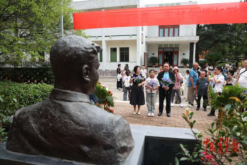 10月3日,四川省梓潼县两弹城景区,游客向邓稼先塑像献花。2025年国庆假期期间,许多游客到此参观,其中不少是青少年。中青报·中青网记者 王鑫昕/摄